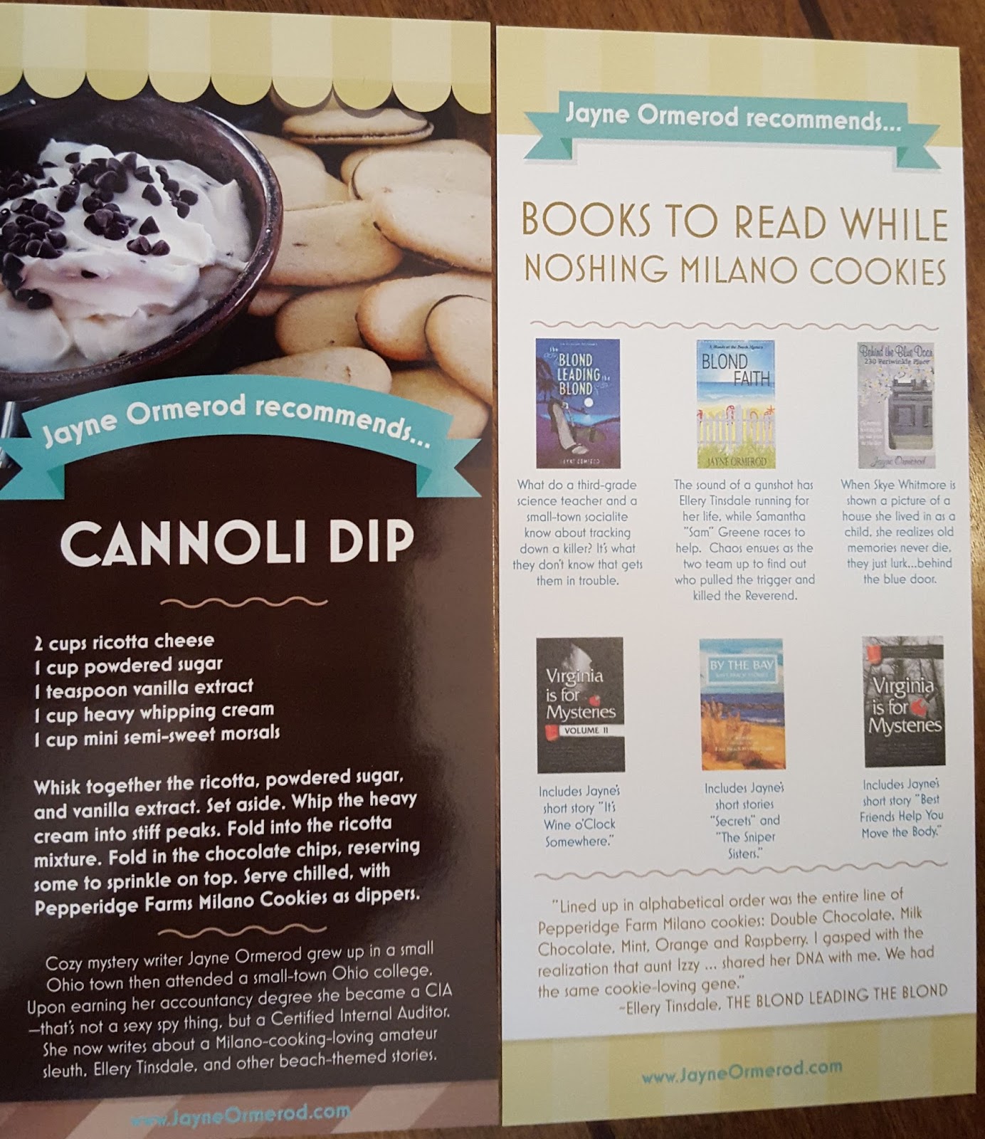 A few months back when I needed to develop a promo item that tied in with my books, I came up with a rack card that had a recipe for Cannoli Dip on the front (best served with Milano Cookies as dippeers), and a complete list of titles on the back, and a small pack of cookies stapled to it. I prepared 400 of them. Presentation was key. How's this for a WOW! factor?